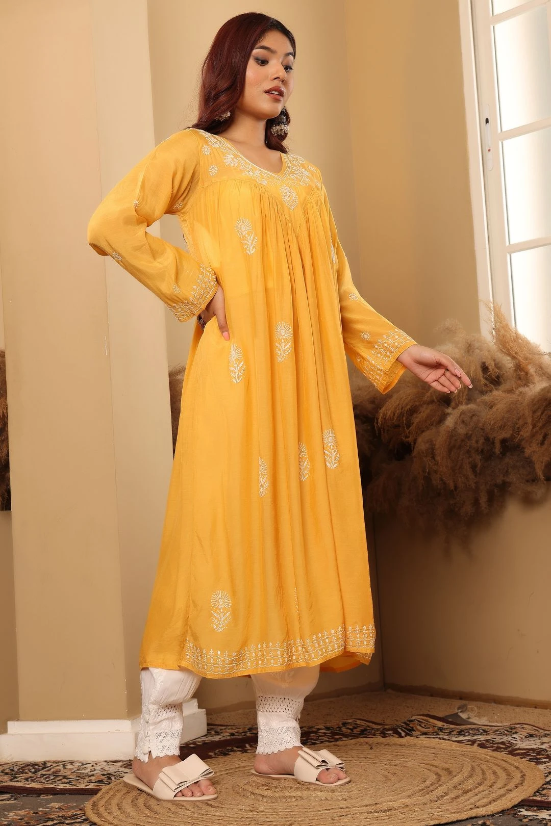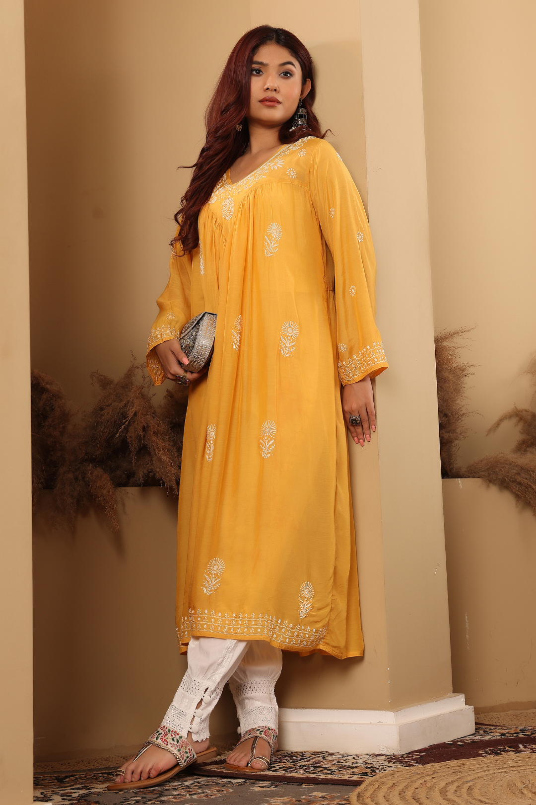 The Alice kurta in a tranquil shade of Mustard brings warm and uplifting charm while staying true to its essence of subtlety and sophistication.Crafted in soft muslin, it features delicate linear chikankari embroidery, it lends a structured elegance to the soft cotton silhouette. The longline design offers a refined edge, making it a versatile choice for office wear, Cultural outings or semi formal gatherings. Style it with white leggings or flared palazzos for a balanced, contemporary ethnic look that radiates effortless grace.